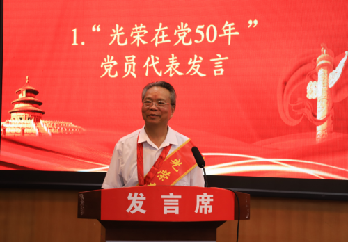 “光荣在党50年”老党员石维海、商学院2021级硕士研究生朱盼盼分别代表“光荣在党50年”纪念章获得者、优秀共产党员发言。石维海表示,退休不褪色、离职不离党,今后将把“光荣在党50年”作为退休生活的“导向标”,永远跟党走、永远听党话,永远做党的人,让共产党员的光荣称号永放光辉。朱盼盼代表全体学生党员郑重承诺,一定牢记“以人名校、以业报国”的校训,立志做有理想、敢担当、能吃苦、肯奋斗的新时代好青年,为全面建成社会主义现代化强国奉献青春和力量。