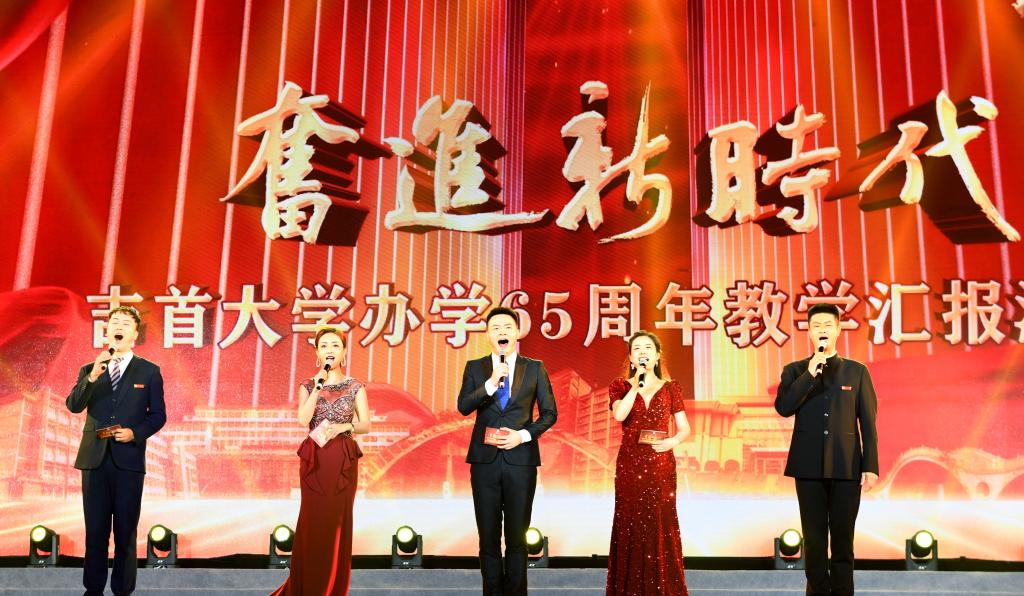 本网讯(谷敏娜 赵金刚 张迪 陈纤纤 刘国燻 徐备 杜欢 李睿阳 相艺 陈关玲 陈凯鹏)“自永玉画里走进书院潕溪,思接千载看大湘西潮落潮起。”由william威廉英国官网党委书记廖志坤教授作词的优美歌曲《武陵文渊》,伴着凉爽的秋风,回荡在william威廉英国官网校园里。10月12日晚,以“奋进新时代”为主题的william威廉英国官网办学65周年教学成果汇报演出在砂子坳校区田径场举行。