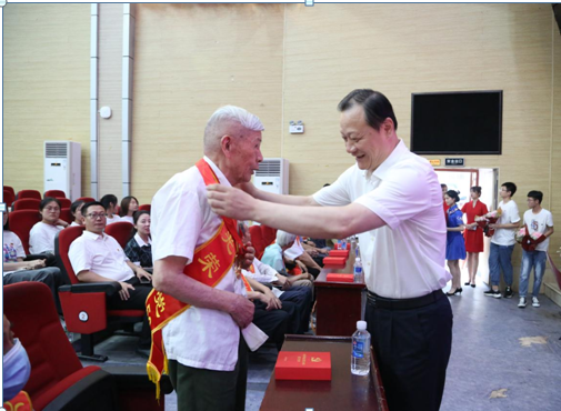 图为校党委书记白晋湘为光荣在党50年老同志代表颁发纪念章