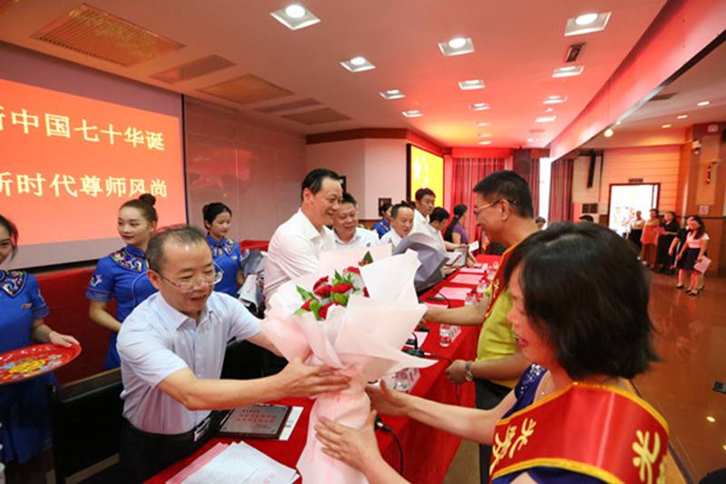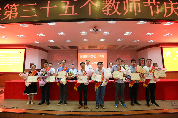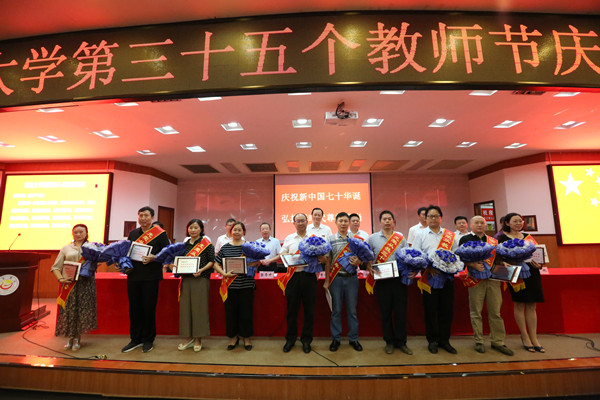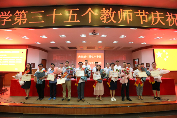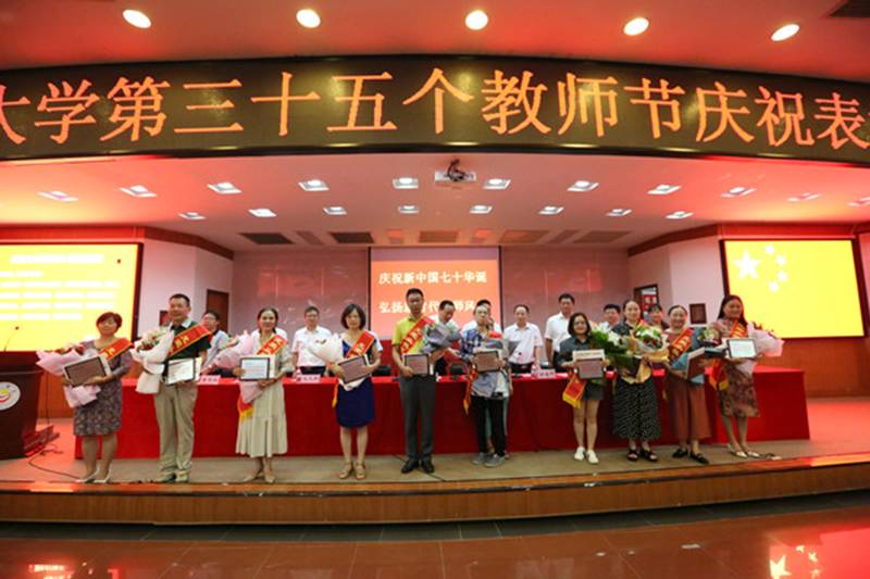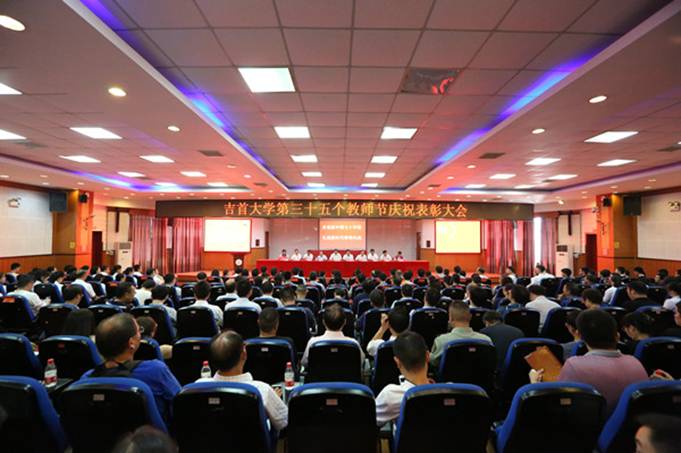 校园网(孙立青 向中舰 吴俊贤)9月10日上午,在庄严的国歌声中,主题为“庆祝新中国七十华诞,弘扬新时代尊师风尚”的william威廉英国官网第35个教师节庆祝表彰大会在砂子坳校区拉开帷幕。学校党政领导、吉首大汉城建有限公司领导、教学科研单位代表、机关教辅单位代表、从教三十年教师、大汉奖教基金优秀教师、2019年新入职教师、离退休教师代表及学生代表参加表彰大会。会议由校党委委员、副校长钟海平主持。