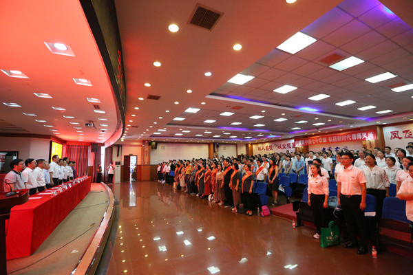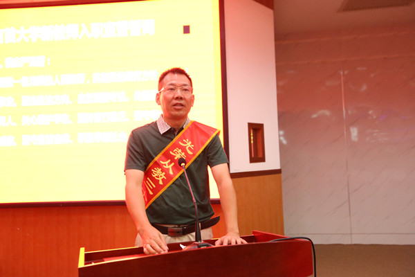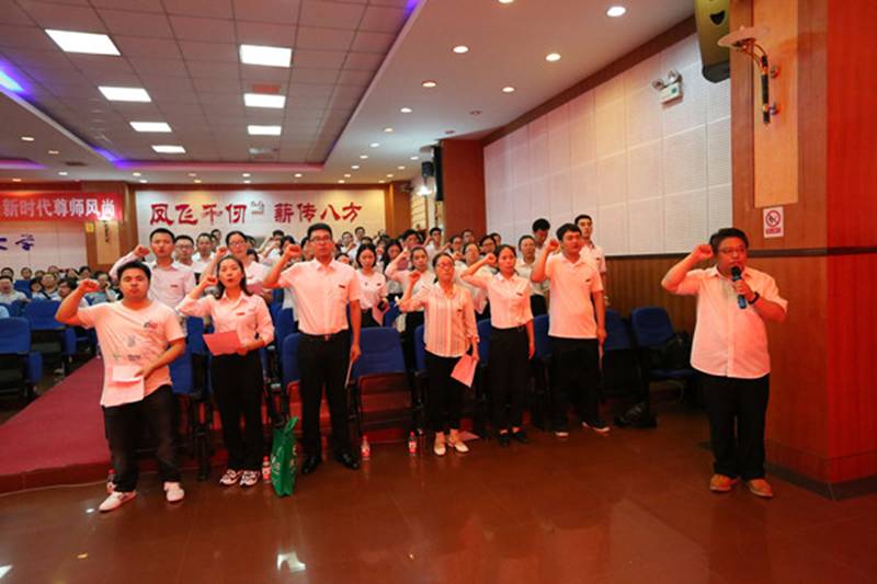 钟海平宣读2019年新入职教师名单。在湖南省优秀教师、湖南省五一劳动奖章获得者麻成金教授领誓下,89名新入职教师面对国旗,庄严宣誓。他们表示,志愿做光荣的人民教师,忠诚党的教育事业。宣誓结束后,新教师为麻成金教授献花。