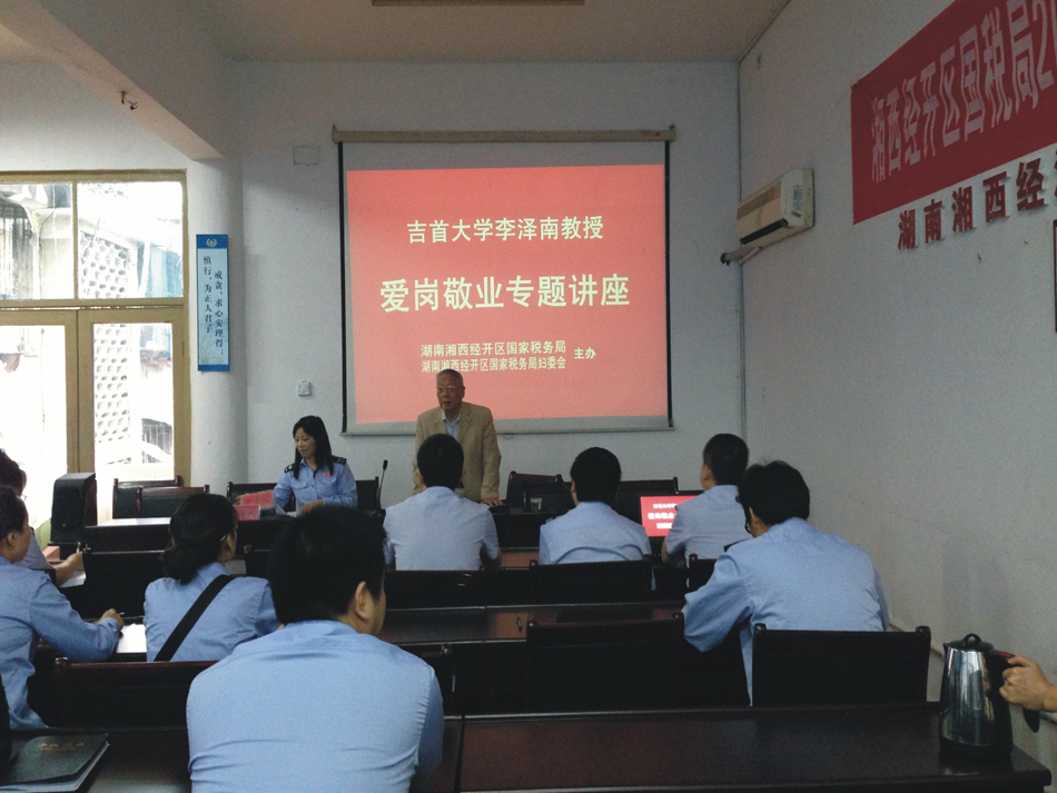 5 月 17 日 上午,应湘西经济开发区国税局的邀请,我校离休干部李泽南教授为该局干部职工做了一场爱岗敬业的专题讲座。他联系自己的人生经历,从岗位与事业的关系、爱岗的前提条件和敬业的行为特征三个方面阐述了爱岗敬业的深刻内涵,并引导大家从人生价值观的角度来认识岗与业的辨证关系。他深入浅出、饱含激情与智慧的讲解,得到了大家的热烈欢迎。(离退处办公室 李希聪)