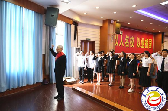 在面向鲜红的党旗,17名师生预备党员在离休干部、优秀共产党员李泽南同志的带领下重温入党誓词,立下忠诚于党的铮铮誓言,表达了为党的事业奋斗终身的决心和愿望。