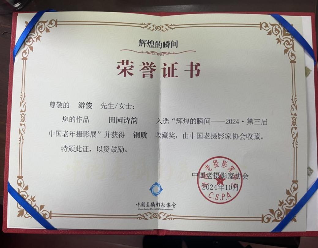 游俊,秉持“弦歌不坠,薪火相传,我们是收获者,也是耕耘者,更是播种者”的理念投身摄影事业。他深知,在促进青年德智体美劳全面发展进程里,摄影作为一门独特艺术,也拥有不可替代的特殊作用。怀着这份对青年成长与行业发展的殷切期许,游俊身体力行,积极搭建与年轻人沟通的“桥梁”。他热忱期望与学生结为朋友,将老同志摄影的一些经验技术传递给学生,使其在美育中得到锻炼、得到成长。他的作品《田园诗韵》聚焦乡村诗意日常,用细腻光影、巧妙构图,呈现田园生活质朴与美好,入选“辉煌的瞬间--2024·第三届中国老年摄影展”并喜获铜质收藏奖,被中国老摄影家协会珍藏。