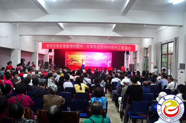 文艺汇演在老年大学京剧班的大合唱《没有共产党就没有新中国》中拉开帷幕,演出者以洪亮的歌声和慷慨激昂的气势歌颂了对中国共产党的热爱之情。汇演共十个节目,由京剧班、舞蹈班、合唱班、学生班、太极队、器乐队六个班表演,舞蹈班分别带来了《不知怎么称呼你》、《绑金梅朵》、《又见北风吹》3个节目,另有京剧、太极、个人独唱、器乐合奏、大小合唱等多种类型演出。丰富多样的节目形式和精彩纷呈的内容引发台下老年同志们的强烈共鸣,赢得阵阵掌声。汇演在《不知怎么称呼你》的歌声中落下帷幕。