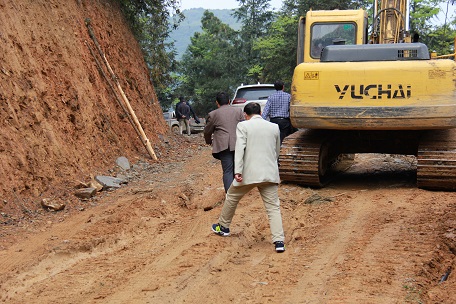 由于近日连续下雨,进村途中,道路湿滑,又突遇道路塌方,老同志们心系群众,克服困难,毅然进村。