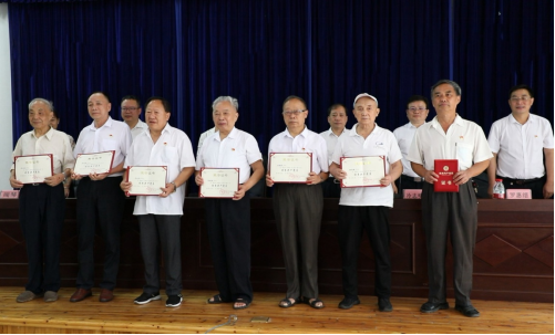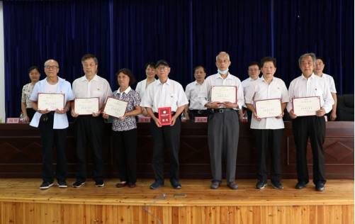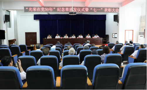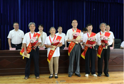 校园网讯(通讯员 郑喆 记者 赵海奇 彭克锋)6月29日上午,“光荣在党50年”纪念章颁发仪式暨离退休老同志“七一”表彰大会在砂子坳校区老年活动中心309会议室举行。校党委书记廖志坤,党委委员、副校长冷志明、王艳,党委委员、宣传部部长罗惠缙以及相关职能部门领导出席。刘玉萍等9名党龄达到50年的老党员获颁“光荣在党50年”纪念章,向成国等24名年度优秀共产党员,廖干等9名年度优秀党务工作者受到表彰