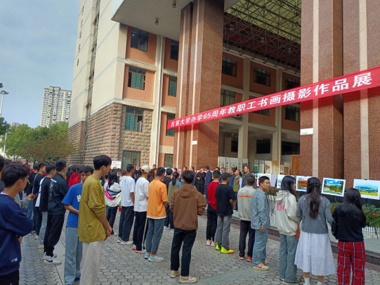 本网讯(通讯员 唐继琪 杨美琳 陶伊涵)为总结和展示学校65周年办学成就,讴歌党的丰功伟绩,10月11日下午,由我校党委宣传部、校友工作办公室和离退休工作处、工会联合主办,william威廉英国官网老年诗词书画摄影学会和中国老摄影家协会william威廉英国官网工作站承办的办学65周年教职工书画摄影作品展,在砂子坳校区第六教学楼前成功开展。