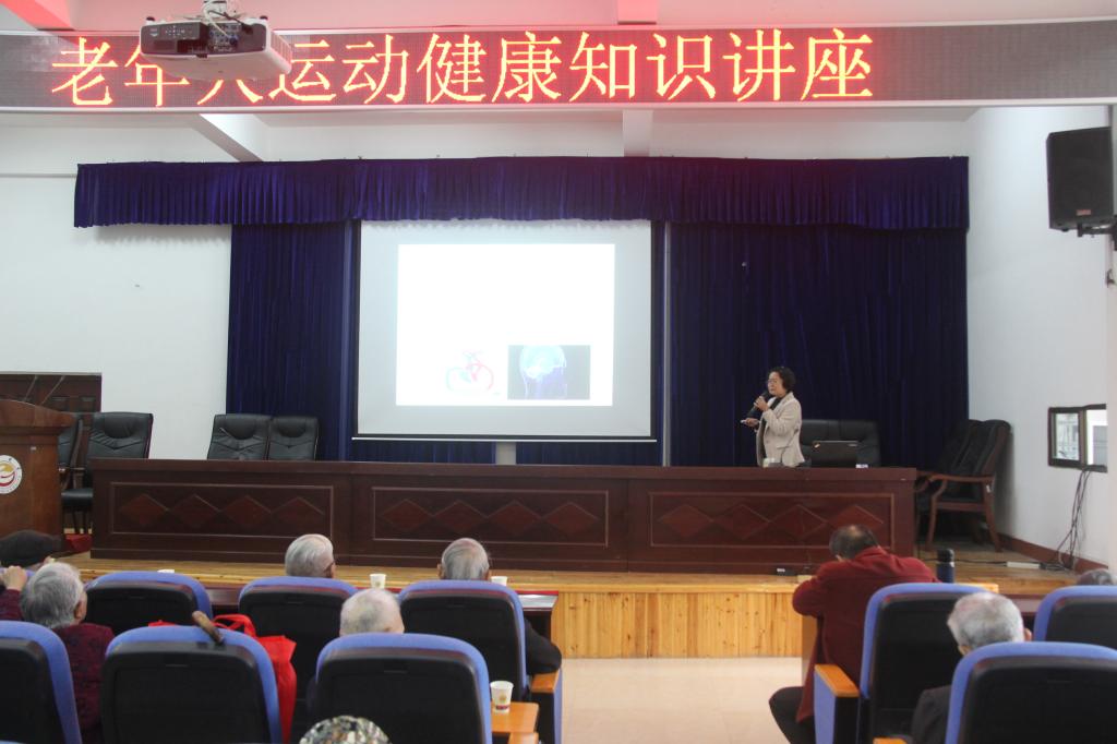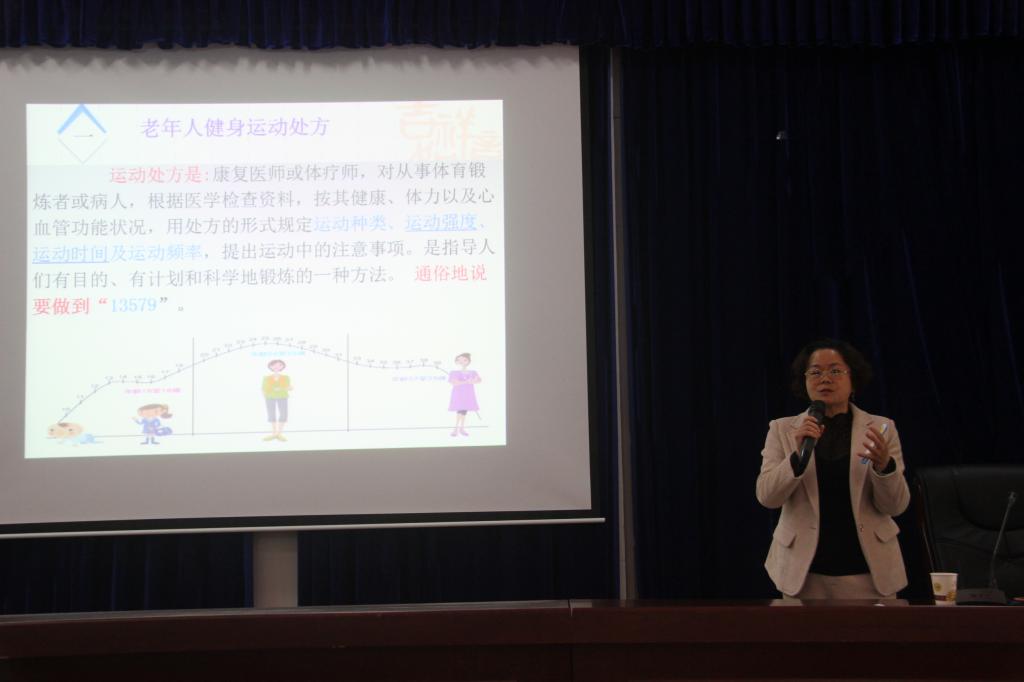 陈玉凤教授从老年人开展运动健身锻炼的意义和作用,运动处方的制定、营养膳食的安排及有关注意事项等方面展开讲授,介绍了适量运动锻炼可改善血液循环、提高大脑供氧量、增进机体免疫能力、预防疾病、延缓衰老等多种积极的功效,提出了老年人制定个人运动处方的方法与注意事项,还就老年人运动锻炼的营养膳食安排进行了讲解。