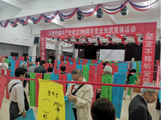 本次活动以“学习中国共产党党史”为主题,设置了涵盖中国共产党百年党史的政治、经济、军事、文化、科技等诸多内容,突出了中国共产党在革命、建设、改革等不同历史时期的路线、方针、政策以及党领导全国各族人民取得的辉煌成就。418道题目被制作成条幅挂在老年活动中心一楼大厅内,参与者选择自己会答的题目,答对后便可以到工作人员处兑奖。老同志们积极踊跃参与答题,活动现场气氛热烈。