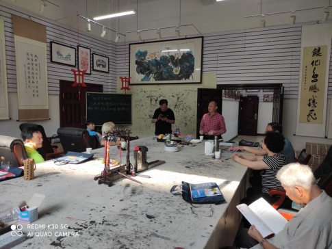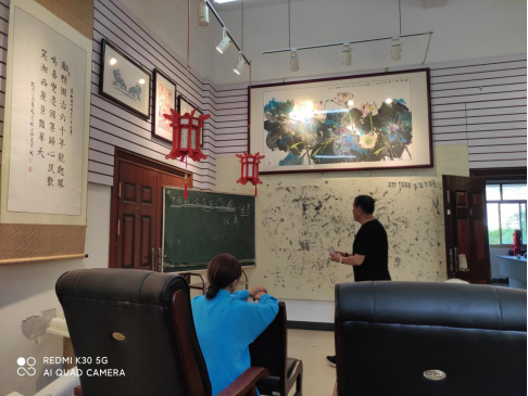 佘明辉老师在第一堂课讲述了书法理论等知识,为下一堂软笔书法教学作铺垫。