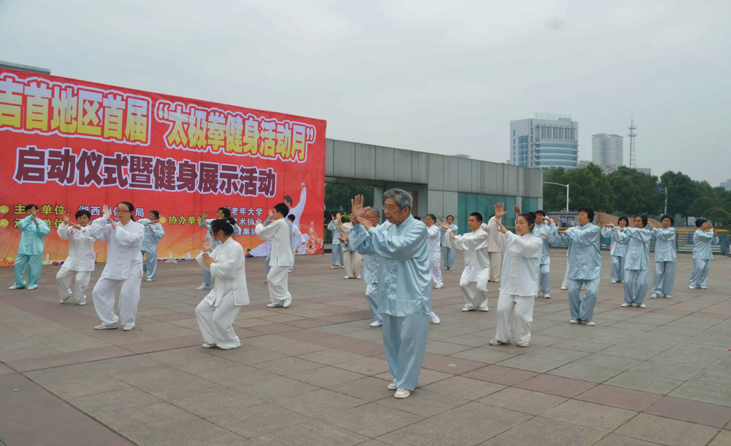 6月5日上午,由州市体育局、州老年大学、州武术协会、州太极拳协会联合举办的2013年吉首地区首届“太极拳健身活动月”启动仪式暨健身展示活动在吉首市乾州新区人民广场隆重举行。我校老年太极拳(剑)协会应邀参加了此次活动。
